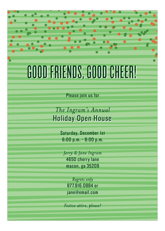 Are you wanting to hold a holiday party, but having a hard time coordinating with family about what time of day would be best to throw the party? Consider an alternative. Instead of throwing a dinner party, why not throw a holiday open house that lasts from the afternoon into the evening? People can then stop by and come and go as they please, in order to fit in the rest of the holiday parties they have to attend throughout the busy day. Order some appropriate holiday open house invitations to let guests know about your event. The Red and Green Falling Confetti Invitation is a fun and simple design that will stand out in guests' mailboxes. The invite features a green striped background. Red and green confetti reigns down from the top of the invite onto the personalized text. Order these invites today, so you can send them out to family and friends as soon as possible.